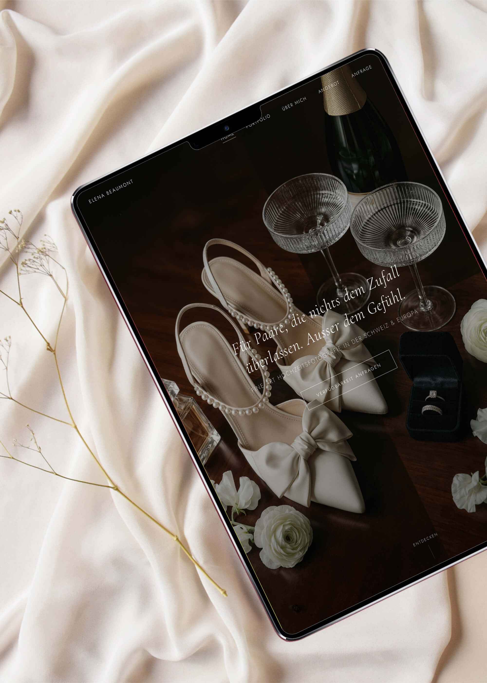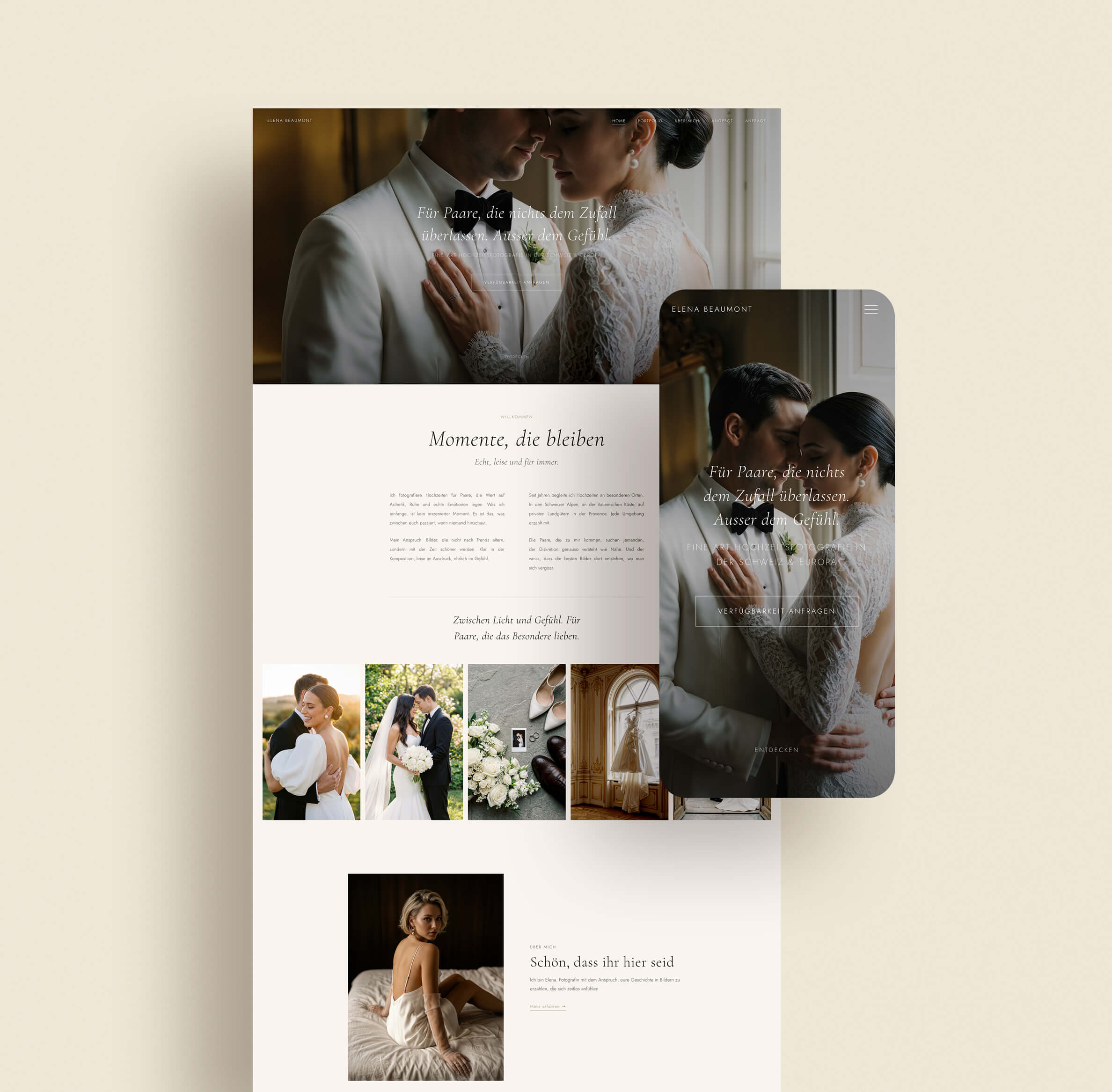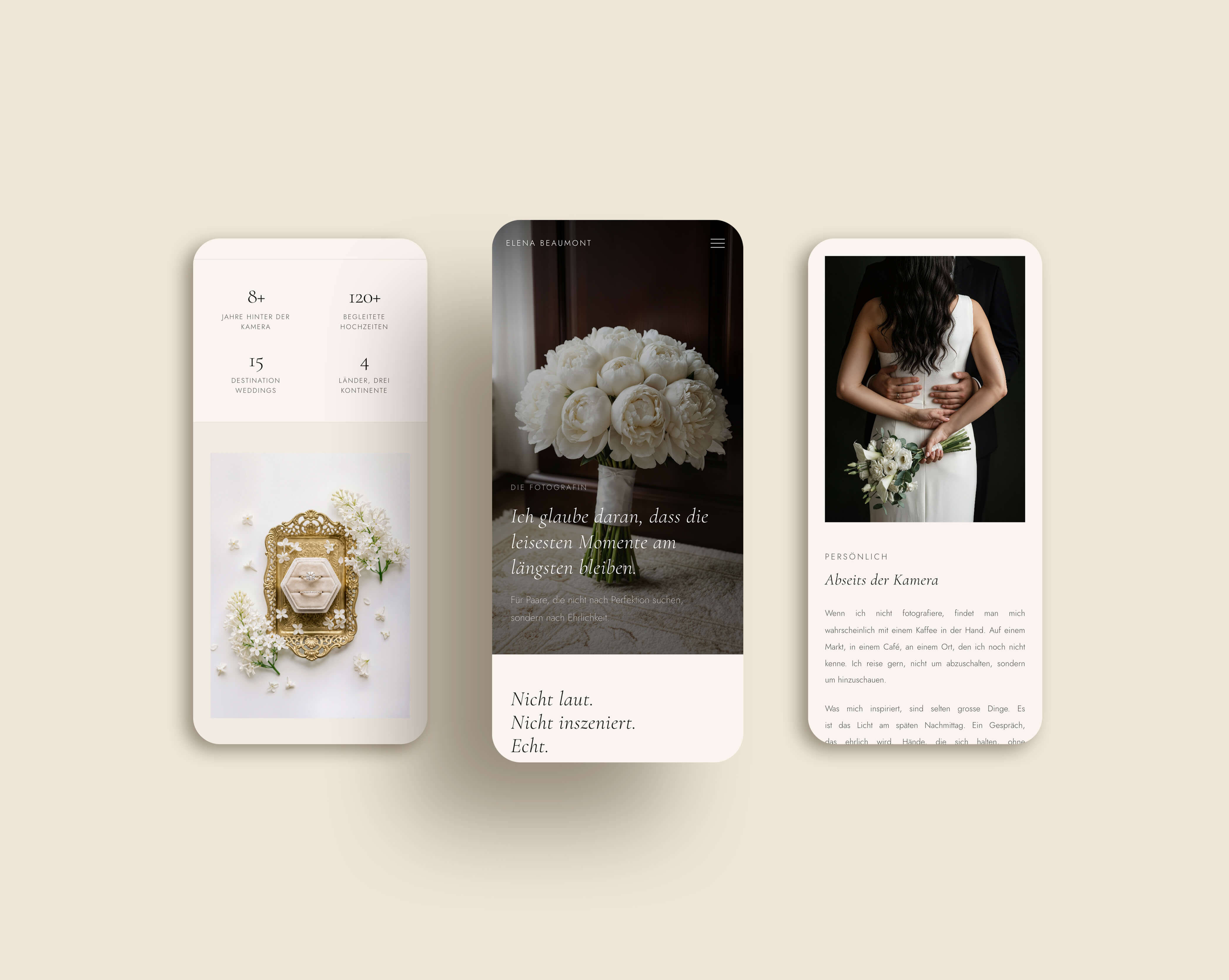 Webdesign & Strategie — 2026Elena Beaumont fotografiert Momente, die bleiben. Still, ehrlich, ungestellt — Fine Art Hochzeitsfotografie für Paare, die das Besondere lieben. Ihr Handwerk ist aussergewöhnlich. Ihre Website war es nicht.