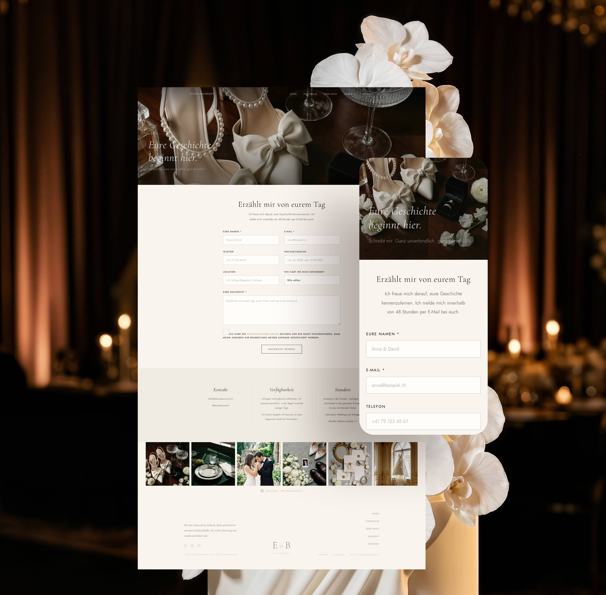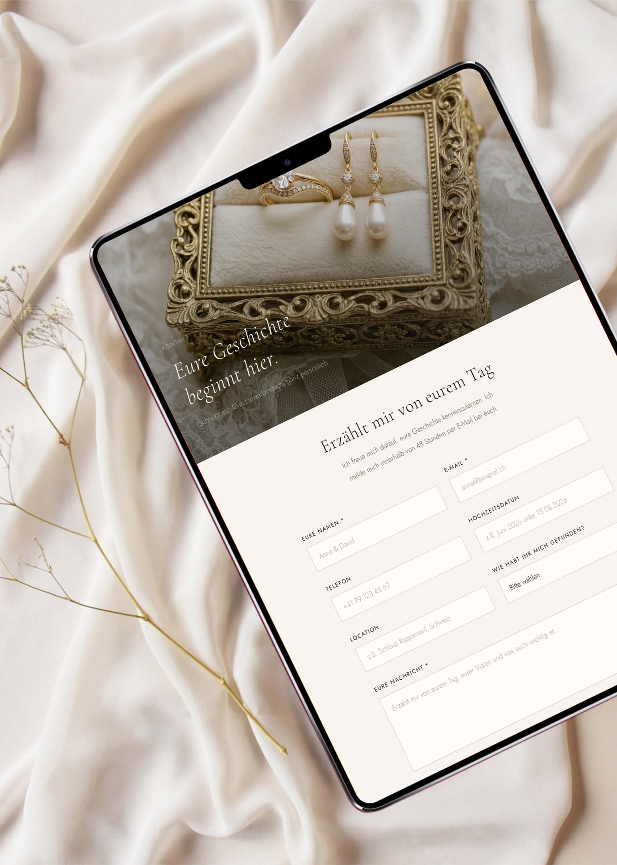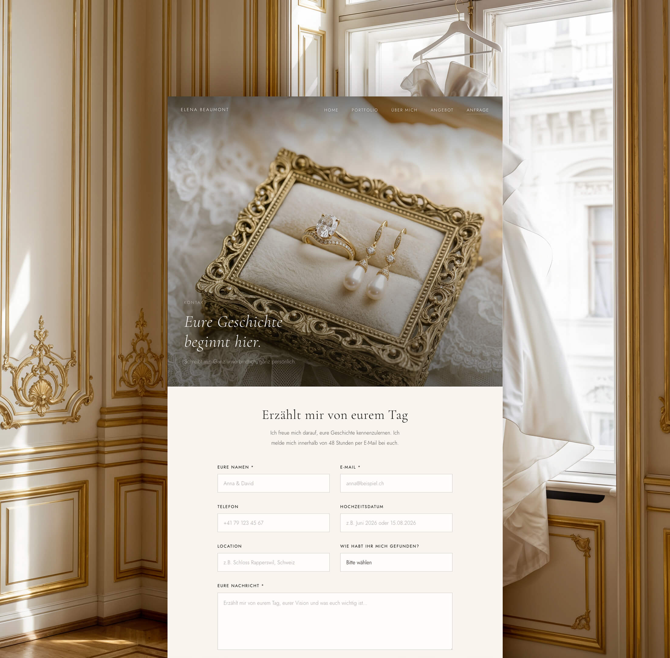 Die Kontaktseite denkt mit: Statt eines generischen Formulars fragt sie nach dem Hochzeitsdatum, der Location und der Vision — damit die erste Nachricht bereits zeigt, dass hier jemand wirklich zuhört.