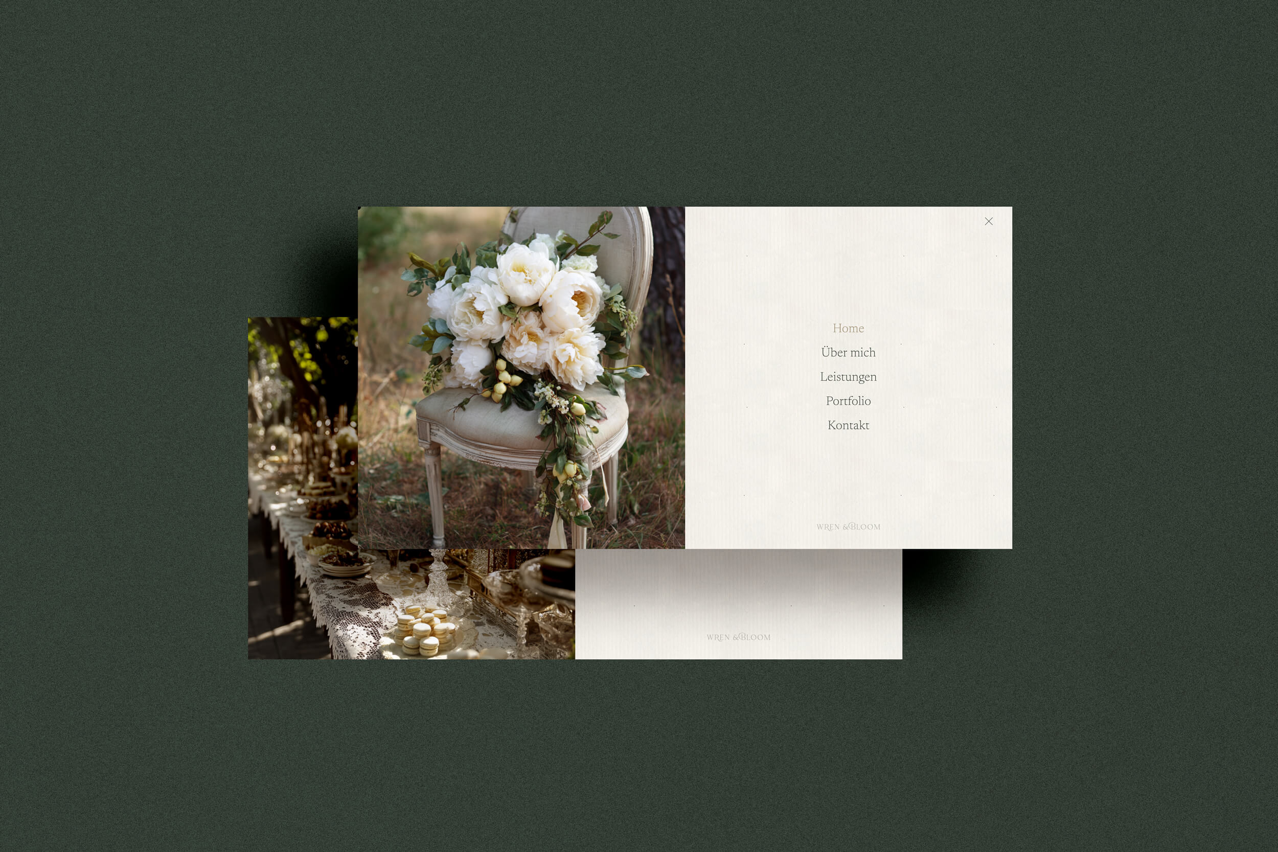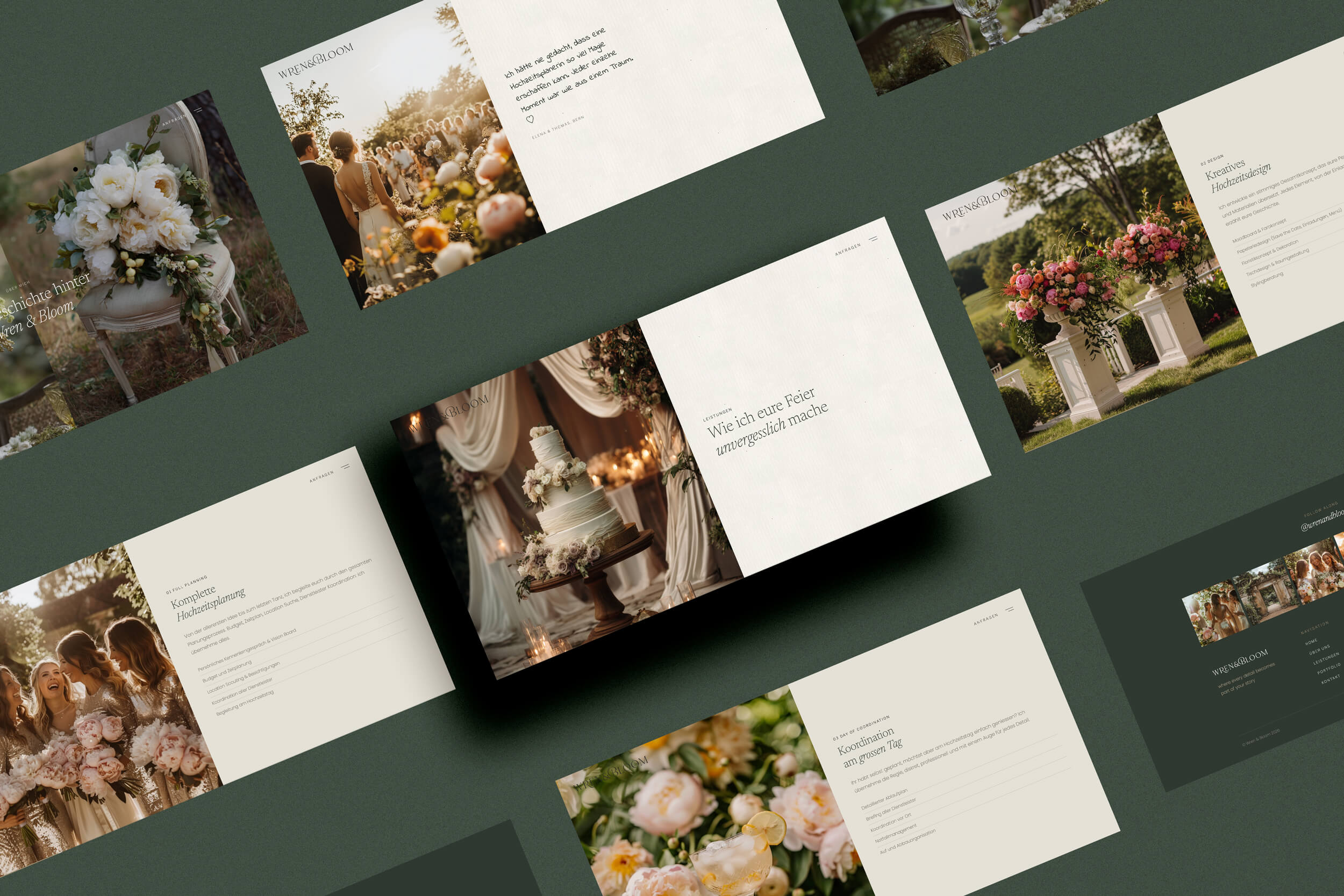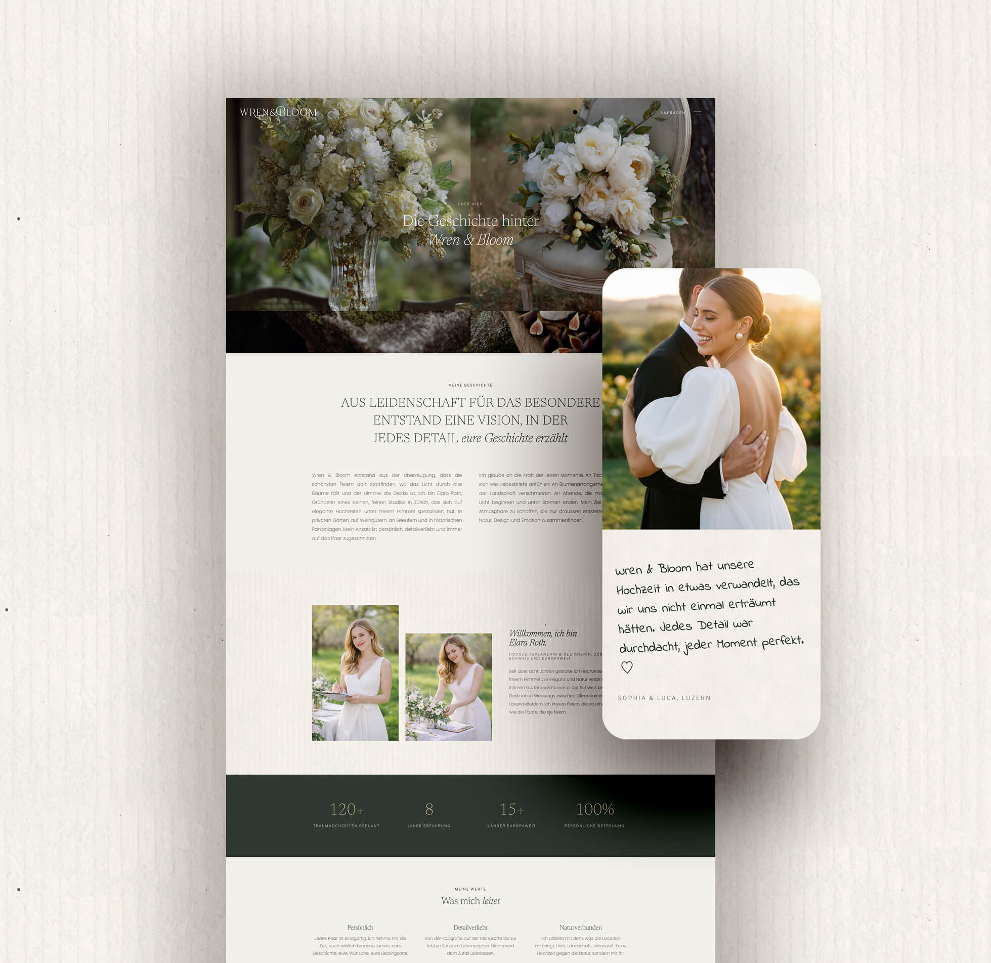 Eine editorial gestaltete Website mit horizontalem Portfolio-Scrolling, Büttenpapier-Texturen, warmen Erdtönen und dunklem Grün. Jede Seite folgt einem bewussten Spannungsbogen — von Emotion zu Information zu Handlung.